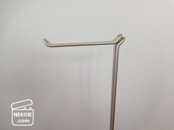 スチール製ホルダーは土台つきでずっしりとしていますが、女性でも片手で持てる重さだと思います。床置きになるぶん掃除のたびに移動する手間はありますが、上のほう(垂直方向の軸部分)を持てば手間も最小限。