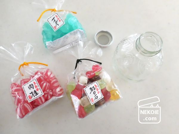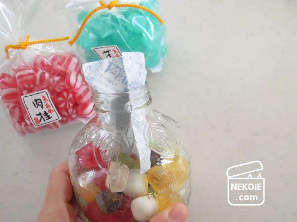 届いてすぐ、自宅用にと思っていた小粒の飴は空き瓶に移し替えました。