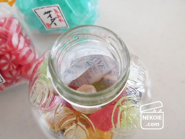 実は最終的に瓶の中の飴が五粒ほどになった頃、脱酸素剤の小袋が邪魔に思えて先に取り出してしまったんです。ところがそれまで瓶を逆さにすればころころ出てきていた飴が、以降はべたべたに。それからは最初に押しこんだ脱酸素剤は瓶が空になるまで入れっぱなしにしておくようになりました。