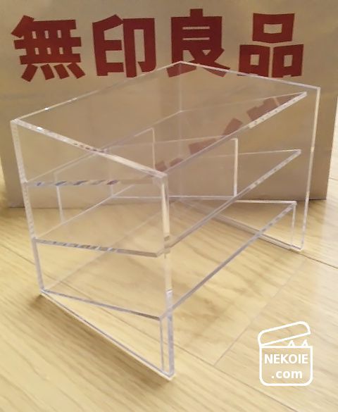 この収納ケース、素材はポリプロピレンで無印良品のPP収納シリーズと似たような質感です。そして同じく、無印良品のアクリル小物ラック↓と似た形状。