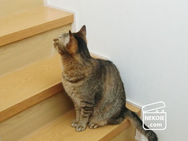 階段掃除中の私について回る兄猫。振り返ると「見てません」アピールでそっぽを向いてしまいました。
