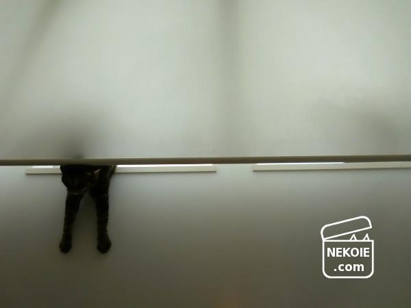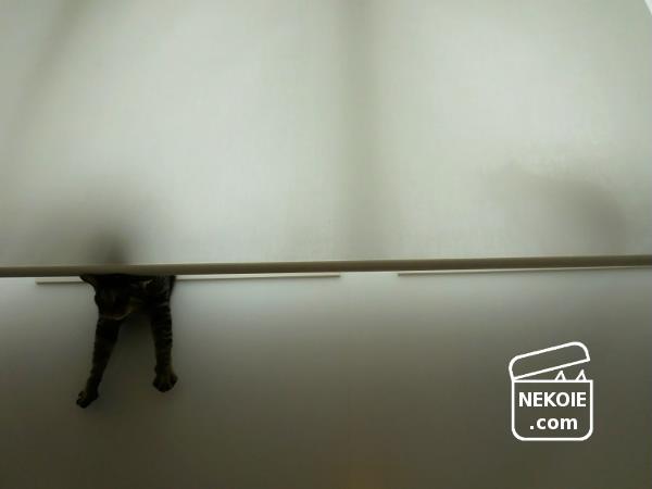 ロールスクリーンの向こう側(窓の下枠)に座って外を眺める猫たち。顔を見せてくれないかな~と呼んでみたところ…
