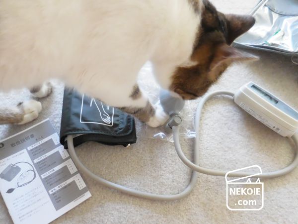 そしてこのゴム球も気になって……私にとっても一つ一つの部位をしっかりとさわるのは初めての経験となった血圧計。私と同じくらい楽しそうに、弟猫が開封儀式につきあってくれました。