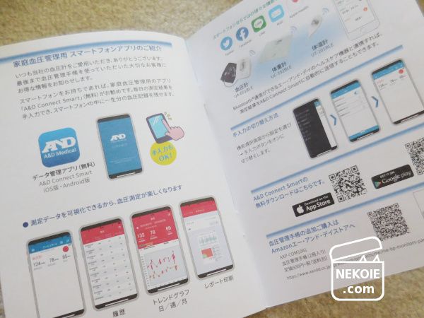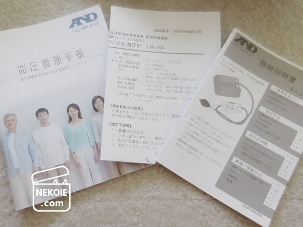 取説以外にも血圧を書き入れることができる手帳なども同梱。私は今のところ手書きで試していますが、アプリもあるとのことでした。