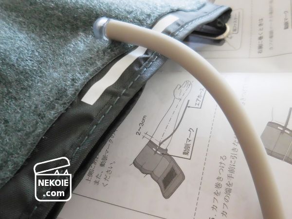 それから「カフ」と呼ばれる腕帯を、ひじより上の位置に巻きます。この動脈マーク(本体では白いテープのような部分)を目安にして装着場所を決めるそう。