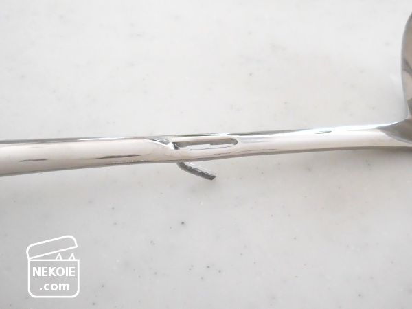 柄の部分に突起(ここも継ぎ目なし)のようなフックがあって、瓶などのフチに引っかけることができるんです。