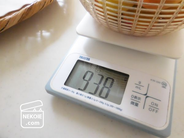 大体940g。この重さに対し約18%(×0.18g)の塩を用意します。