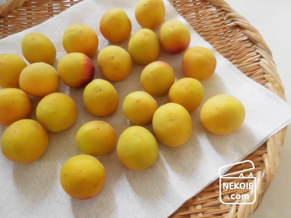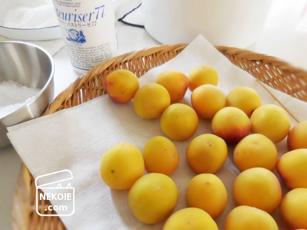 買ってきた梅はやはり洗う必要があると思っているけれど、水分(水道水)が残ったままの状態では仕込み後のかびや傷みにつながるので、しっかり拭いた後でも数時間は燥時間をとるようにしています。