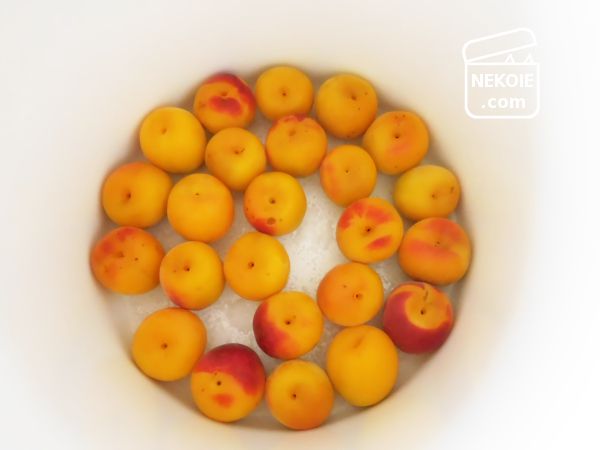 完熟梅は青梅ほど硬くはなく、外皮が起毛していて小粒な桃のようにも感じます。扱いは終始、そっと。洗い終えたら清潔な布巾でやはり一粒ずつ拭き上げ、盆ざるに広げて一晩乾かしました。