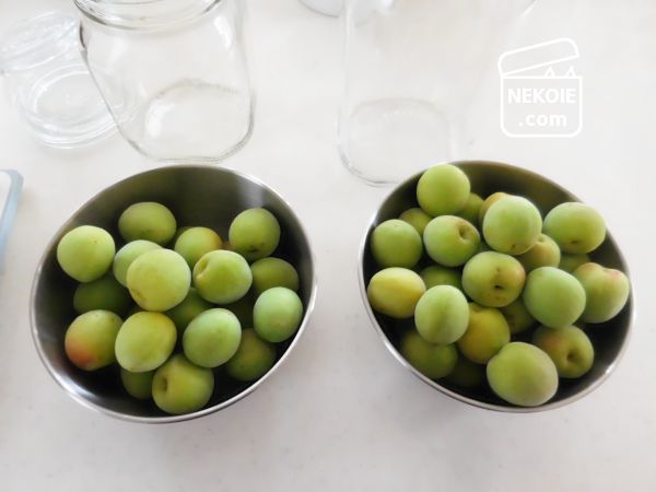 用意した梅は1kg。瓶は3~4Lのものが適当とのことでしたが、大瓶に空きがなかったので400gと600gに分けて漬けることにしました。