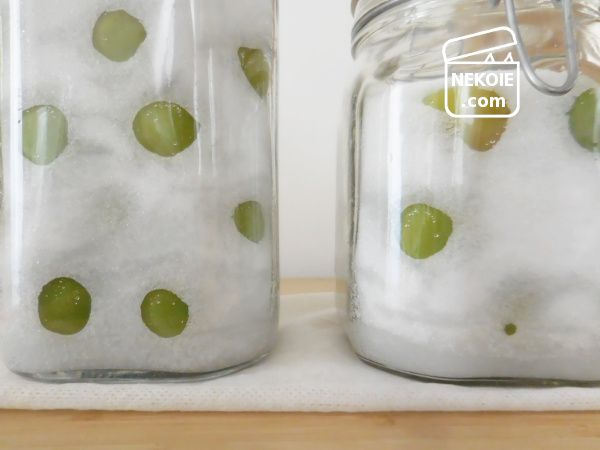 グラニュー糖のデメリットを前述しましたが、この梅のへたを取り除いたところに砂糖が入りこむのはメリットといえるかもしれません。浸透圧で出てくる水分が即座に細かいグラニュー糖に吸収されるので、かびが発生しにくくなるかもしれないなと。