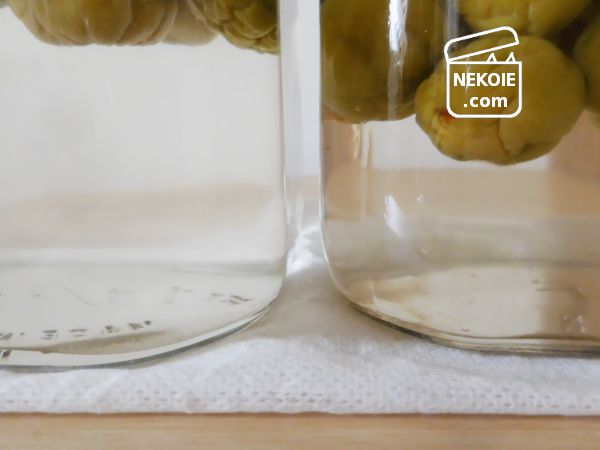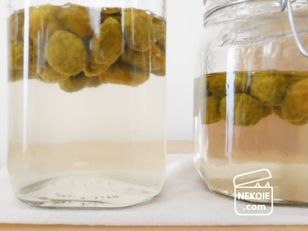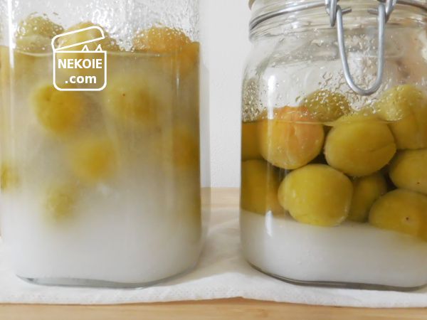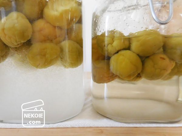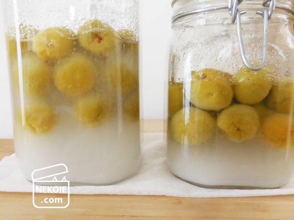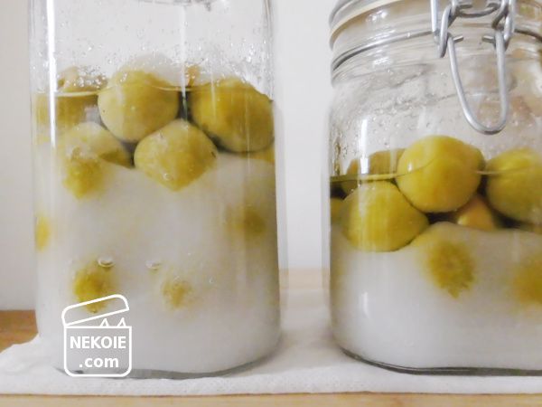 砂糖が完全に溶けきるにつれて梅の果実が浮いてきます。その部分だけは長時間シロップに浸かっていないことになるので、腐りやすさにつながるのではと思いました。そのためだいぶ砂糖が溶けてきた頃からは、浮いている梅の上下が入れ替わることも意識しながら振るようにしています。