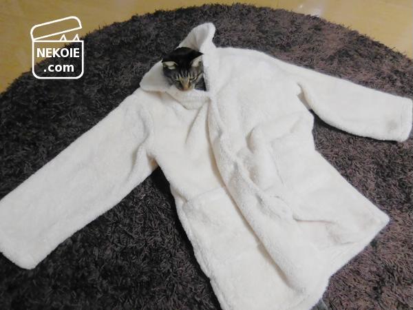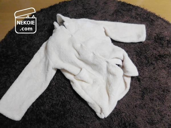 計三着の着る毛布のいずれかを猫に譲る計画でしたが、結局、今年購入したばかりの着る毛布が一番猫に使ってもらいやすいという事態に…。