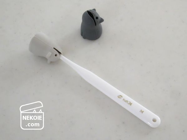 立てるときは歯ブラシの持ち手側を猫の口に。これなら定期健診での持ち出し用キャップだけでなく、日常的に収納グッズとしても使えます。しまいこむ必要がない2way仕様が、私にとっては最大の魅力でした。