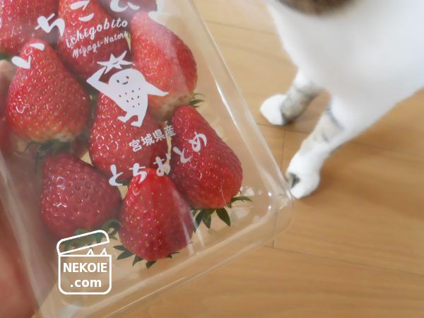 買い物から戻ったとき、いちごを持っていると香りでわかるらしい猫たちはそわそわしています。他の食材を冷蔵庫に収めるよりも早く、いちごを洗い、へたをとり、猫たちに献上するのが私の仕事。