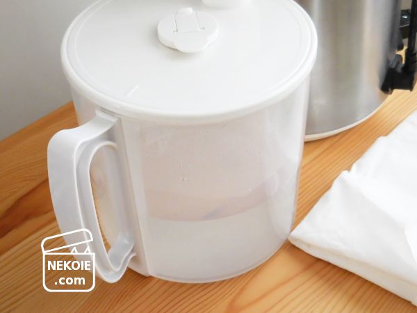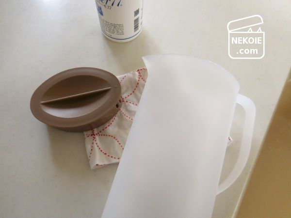 できあがった蒸留水を使って、朝一番に猫たちの飲み水を交換(およそ1リットル)。残りは先にも書いたとおり冷茶ポットなどに移してから、冷蔵庫へと入れています。