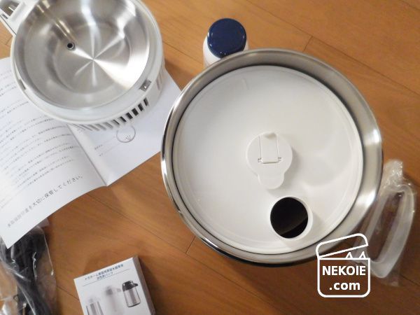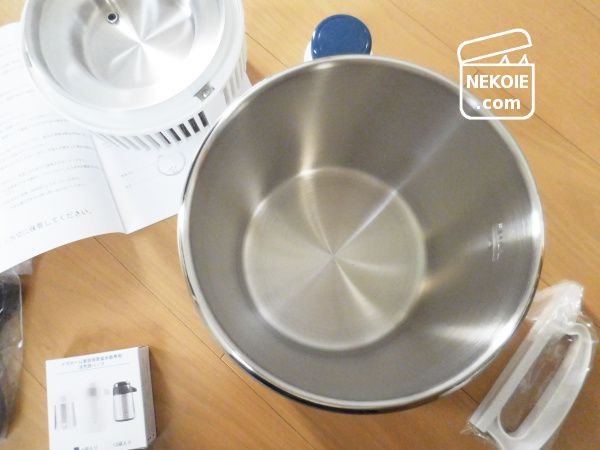スチールといっても、外装がスチール製、内釜(水を入れるところ)はステンレス製だそう。また外側のスチール面には塗装もされています。スチール製だとよりさびの心配がありますが、塗膜ありの外側だけなら少し安心のように感じました。