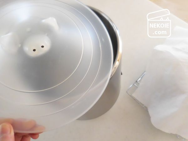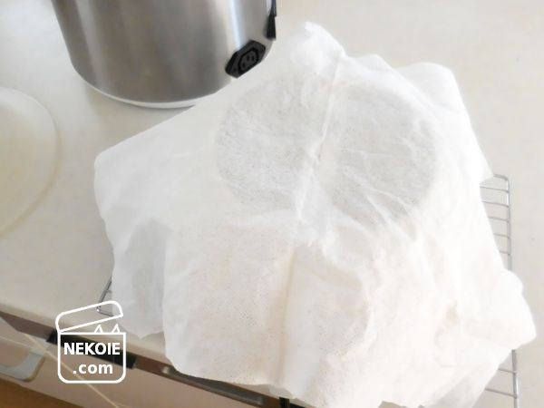 ちなみにステンレス釜と蓋は使用中以外分離させた状態で乾燥させているため、その両方にほこり避けが必要でした。蓋のほうは前述どおり水滴の拭き取りにつかったふきんなどをかぶせていますが、ステンレス釜のほうはこちら。