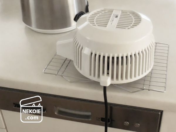 蓋の上部は写真のとおりの柵状で、その奥にはファンがついているのだけれど、分解ができないために汚れた後は掃除がしにくそうなんです。何かしらのカバーを用意するつもりだったのですが、使用後のふきんが役に立ち、ある意味効率的でした。