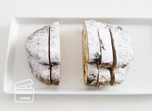 クリスマスまであと一週間。当日を待ちながら、数日間かけていただくシュトレンですが、食べ始めは真ん中から切って、くっつけておく。