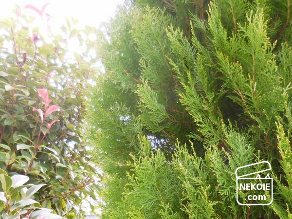 コニファーというのはカフェなどの目隠しにも使われることがある針葉樹の総称。たくさん種類があるのですが、今回は(たぶん)ゴールドクレスト。小さな苗(50cmくらい?)から、見上げるほどにまで成長しました。トウヒより圧倒的に伸びが速いです。
