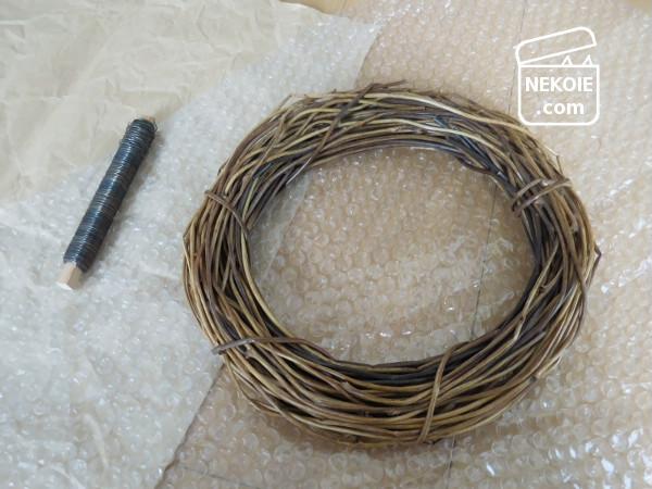 買ったのはリースの土台と、リースワイヤーと呼ばれる針金だけ。悩みに悩んで選んだ土台サイズは、24cm。近くの花屋さんで扱われていて、あわせて300円くらいでした。