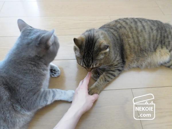 どうやらきな粉のニオイがする手をクンクン。
