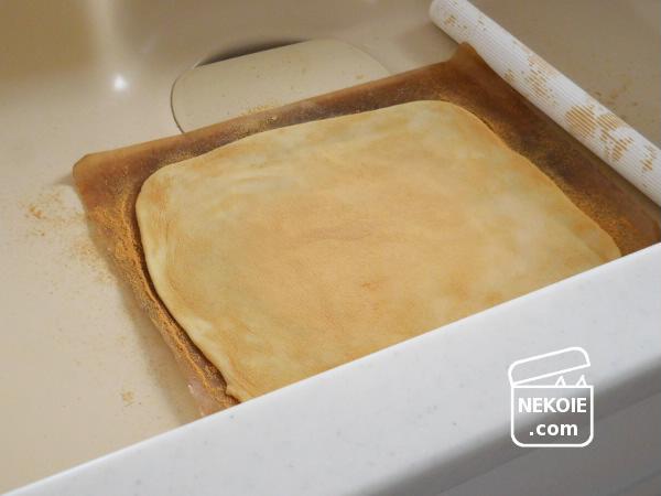 打ち粉にきな粉+シナモンパウダーを使って、平たく伸すだけ。敷いているのは使い捨てないオーブンシートです。