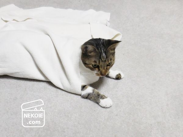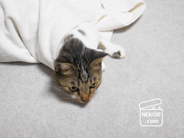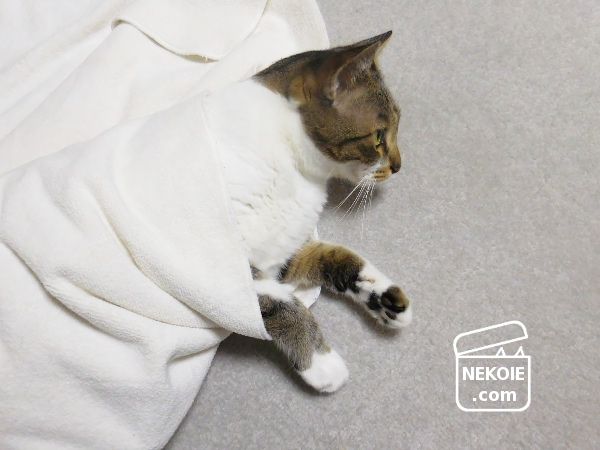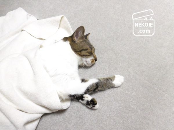 もともと敷いていたカーペットタイルに、薄手ながらタオルの厚みが加わったぶん、寝ころんだときなどの背中へとかかる負担も減って、とてもいいです。またこのバスタオルは使わないときはたたんで、リビングのすみっこに残しておくのですが、そこも猫のベッドになりました。