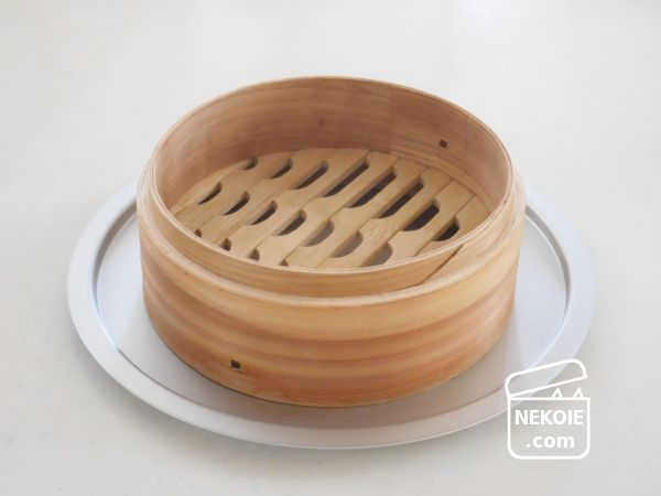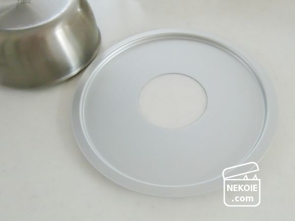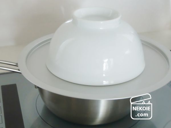 - 最後のあたため(湯気が立つ状態)のタイミングで鍋に受け台をのせ、食器をかぶせる。