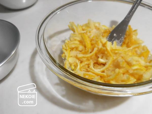 それから皮をスライスして、絞った果汁、半量の砂糖と和えます。
