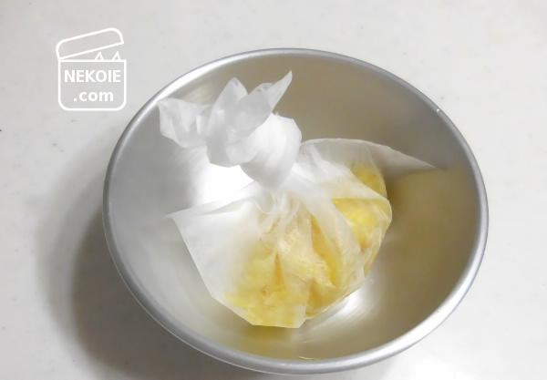 不織布タイプの排水口ネットに入れて、口元を結び、お風呂へ。