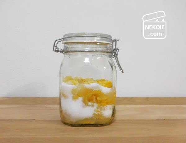 - 柚子皮スライス+果汁に、規定量の砂糖半分を和える。