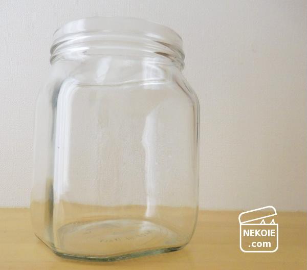 大きめのジャムの空き瓶など、再利用で使える場合も。小さな瓶で複数個に分けてもいいと思いますが、途中で「振る」工程があるので、少し余裕をもたせて詰めると楽です。
