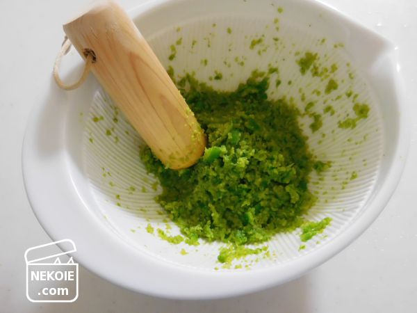 この状態で計量し、ほぼ同量の青ゆず・青とうがらしをあわせたら、すり鉢でごりごり。